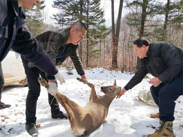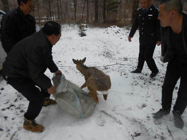 为确保野生动物存活,4月1日上午,红石森林公安分局二道沟中心派出所会同红石林业局野生动物保护协会工作人员和二道沟林场林政科工作人员,一同将两只野生狍子放生回归大自然。