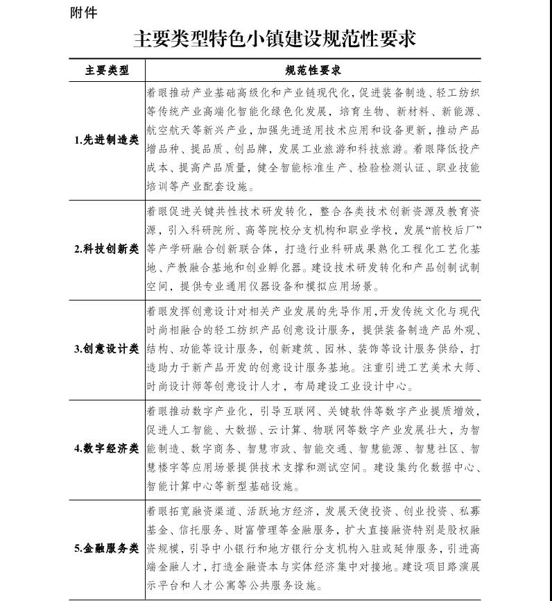 (三)产业主导。特色小镇应秉持少而精、少而专方向,在确实具备客观实际基础条件的前提下确立主导产业,宜工则工、宜商则商、宜农则农、宜游则游,找准优势、凸显特色,切不可重复建设、千镇一面,切不可凭空硬造、走样变形,切不可一哄而上、贪多求全。制造业发达地区可着重发展先进制造类特色小镇,先进要素集聚地区可着重发展科技创新、创意设计、数字经济及金融服务类特色小镇,拥有相应资源禀赋地区可着重发展商贸流通、文化旅游、体育运动及三产融合类特色小镇。