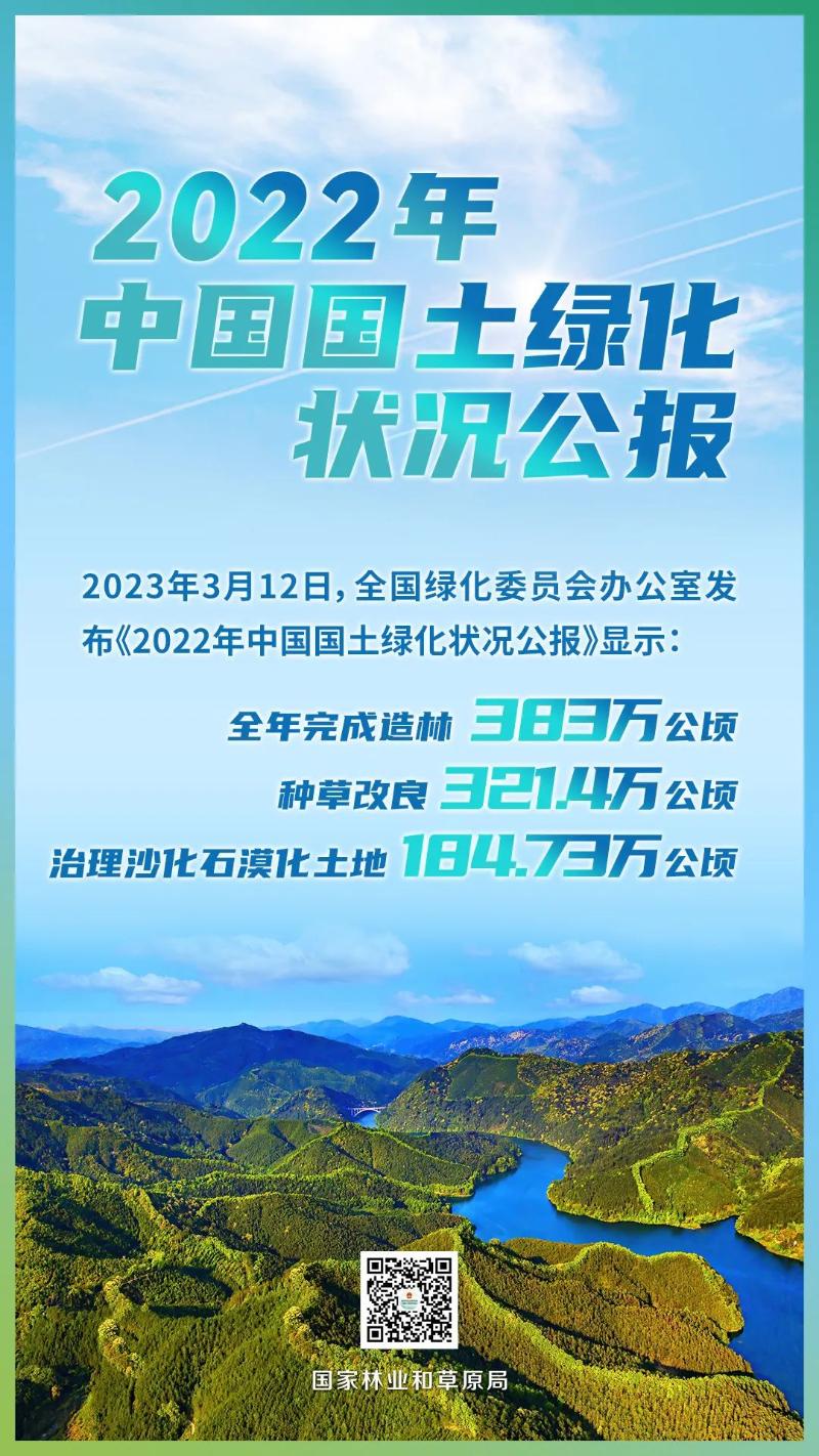 2022年,全国各地、各部门认真贯彻习近平新时代中国特色社会主义思想和党的二十大精神,深入践行习近平生态文明思想,统筹推进山水林田湖草沙系统治理,科学开展大规模国土绿化行动,取得明显成效。全年完成造林383万公顷、种草改良321.4万公顷、治理沙化石漠化土地184.73万公顷。目前,我国森林面积2.31亿公顷,森林覆盖率达24.02%,草地面积2.65亿公顷,草原综合植被盖度达50.32%。