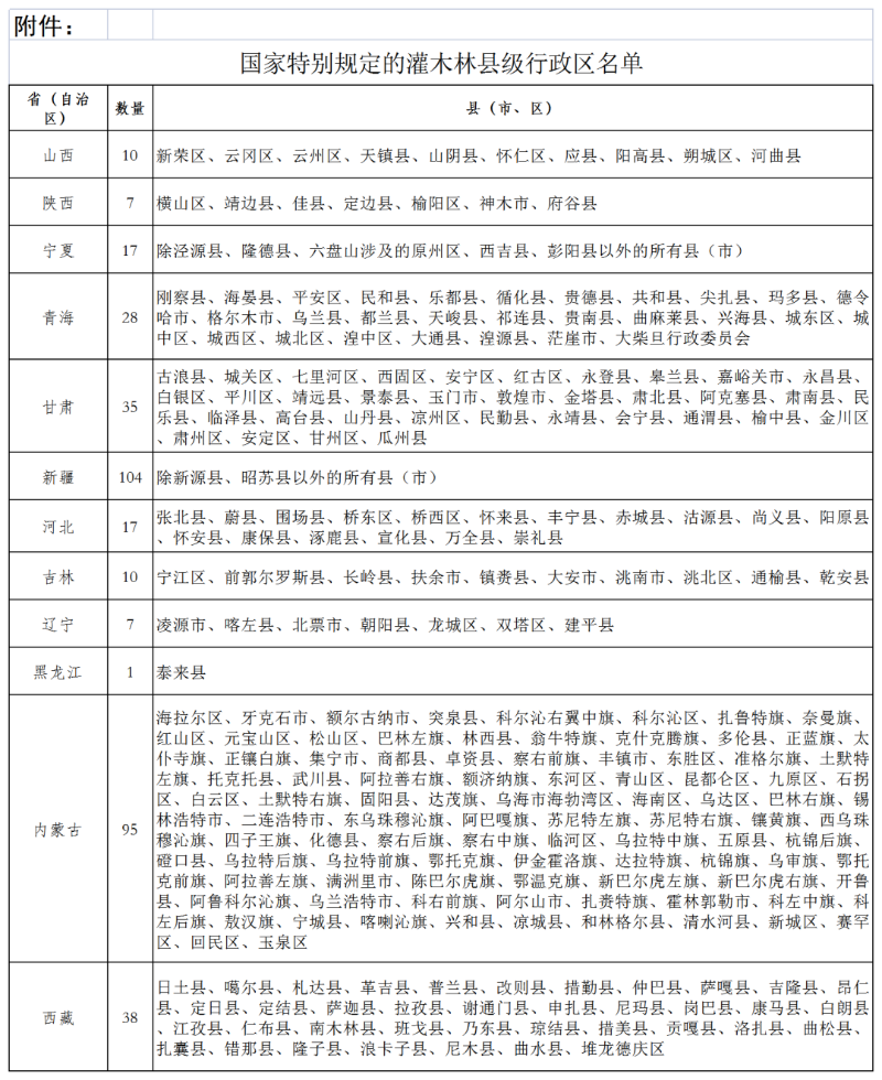 国家特别规定的灌木林,是指分布在年均降水量400毫米以下的极干旱、干旱、半干旱地区,不包括乔木分布(垂直分布)上限以上地域的灌木林。
